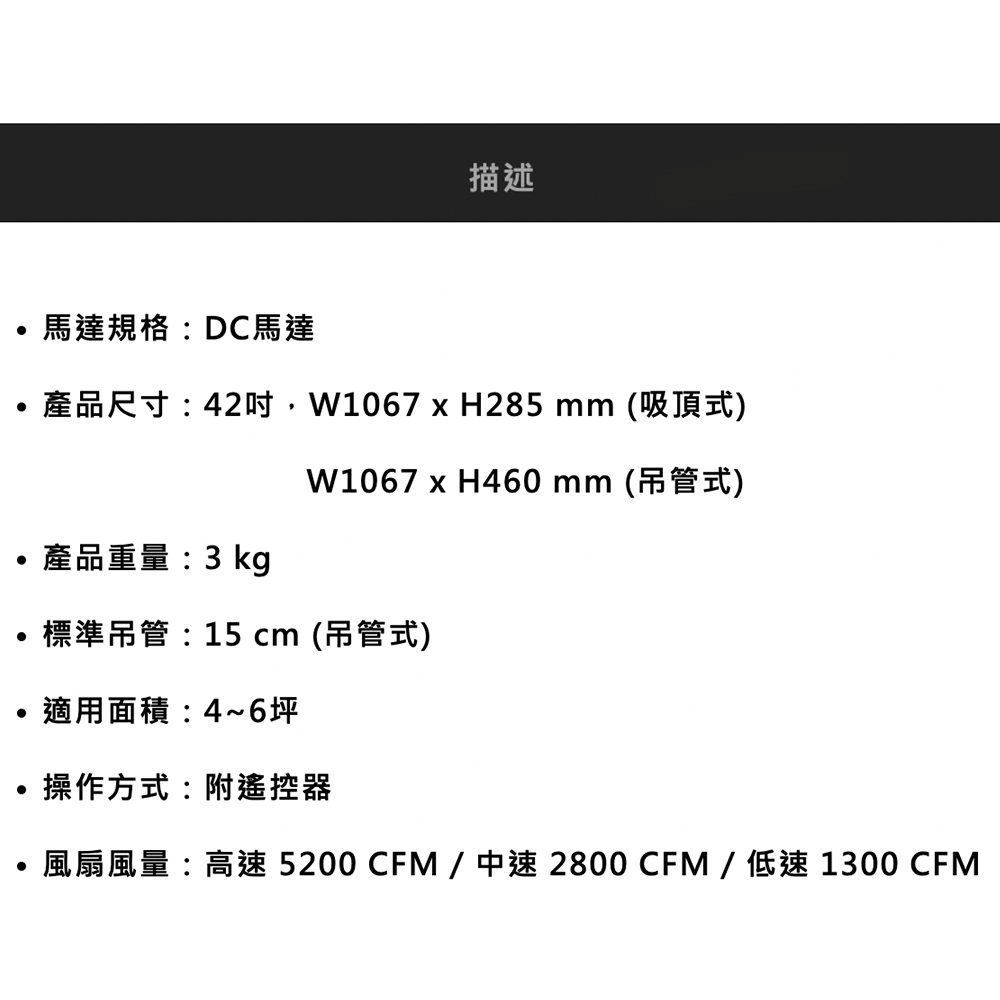 - 風扇風量:高速 5200 CFM / 中速 2800 CFM / 低速 1300 CFM