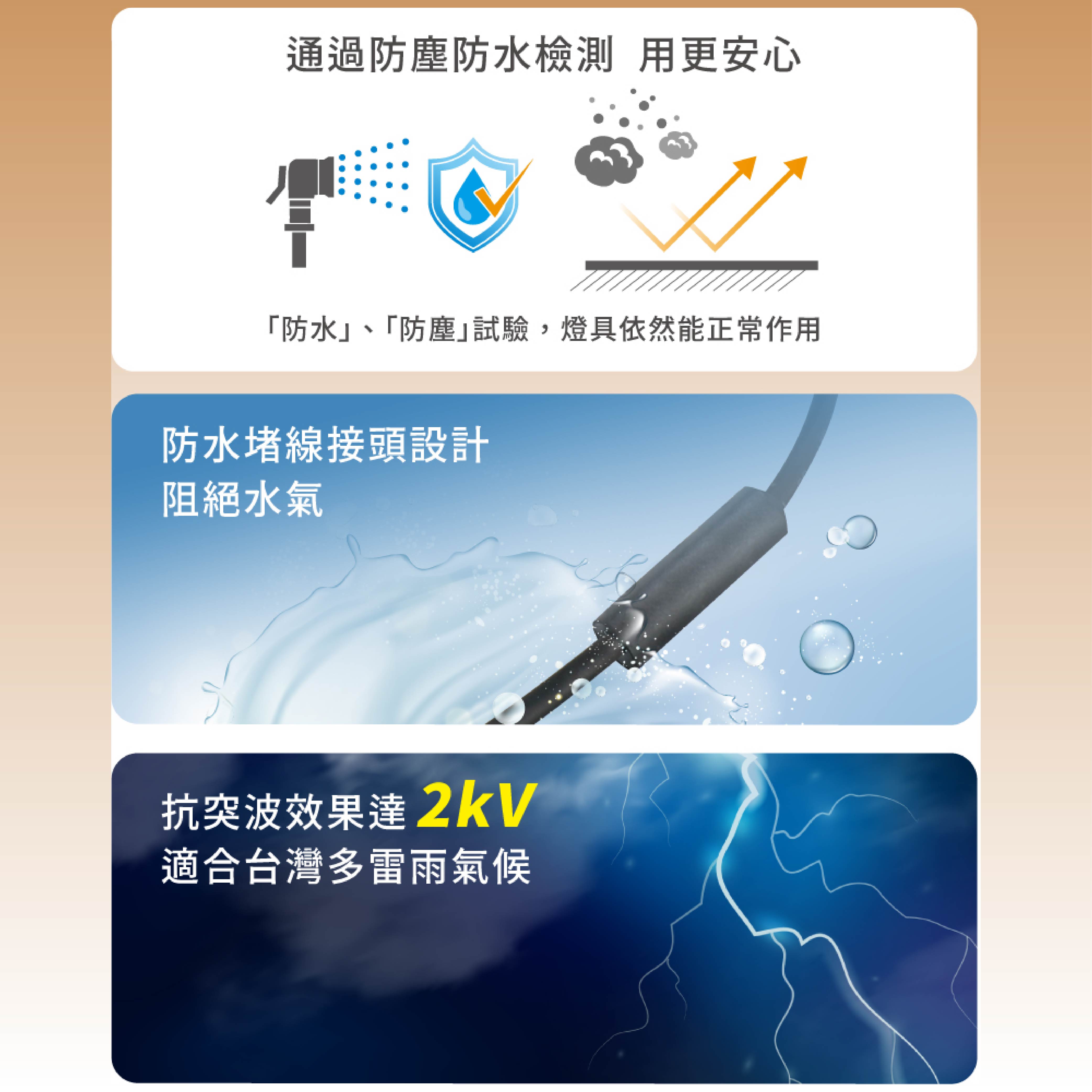 ✦ IP66防塵防水等級 ✦ 防水堵線 有效防止水氣滲入 ✦ 貼心腳踏設計 安裝更省力 ✦ 抗突波達2kV 雷雨氣候適用