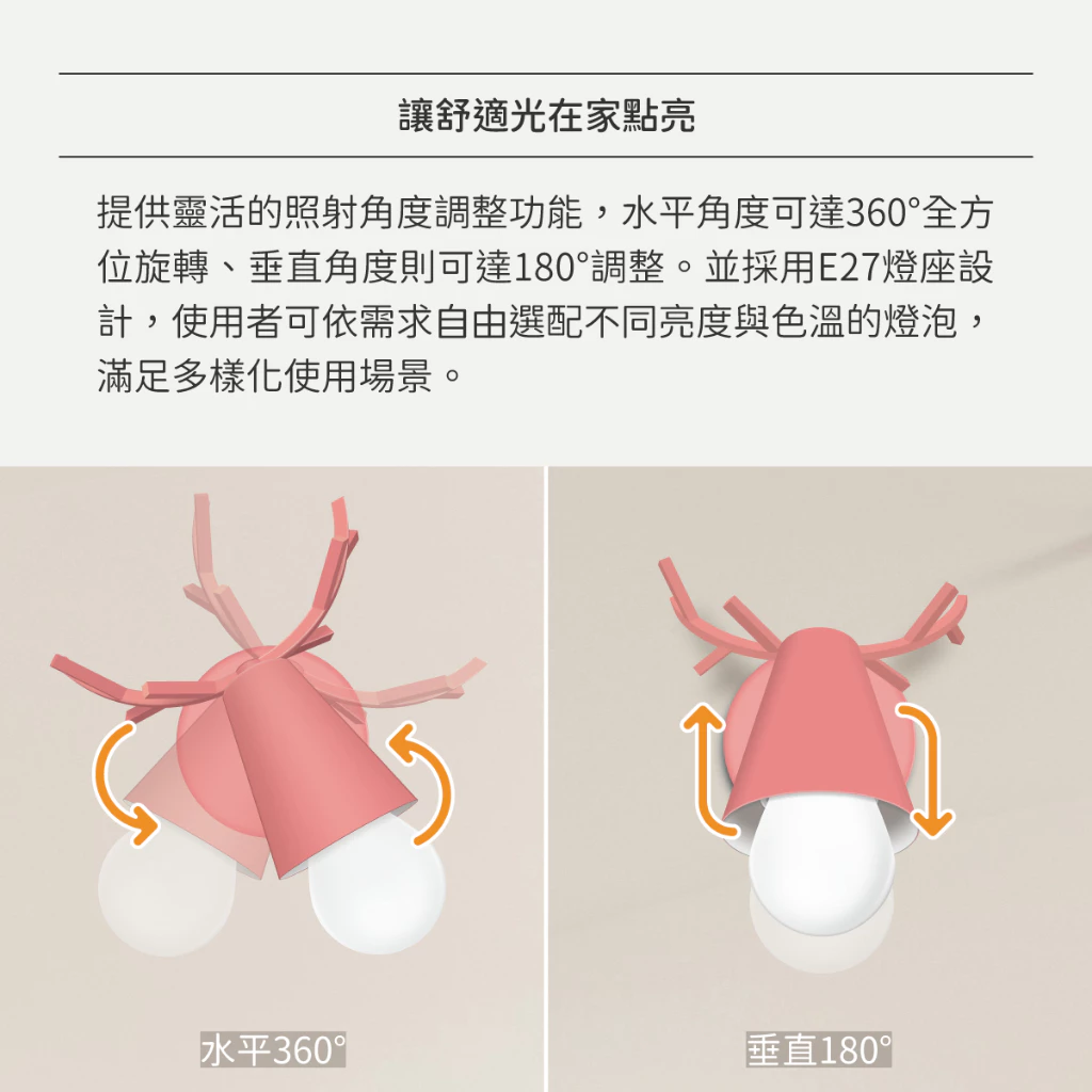 ⦁ 搭配E27燈座,可替換光源,使用最方便