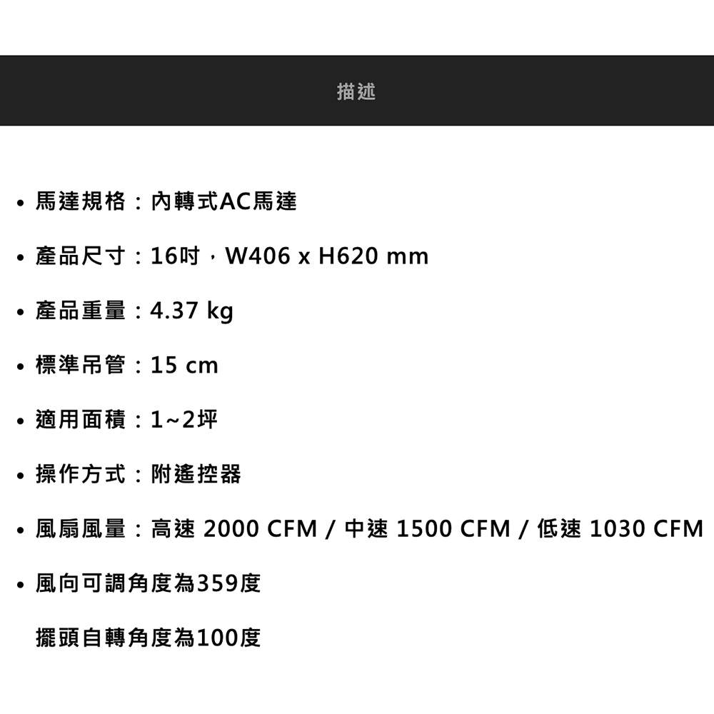 - 風扇風量:高速 2000 CFM / 中速 1500 CFM / 低速 1030 CFM