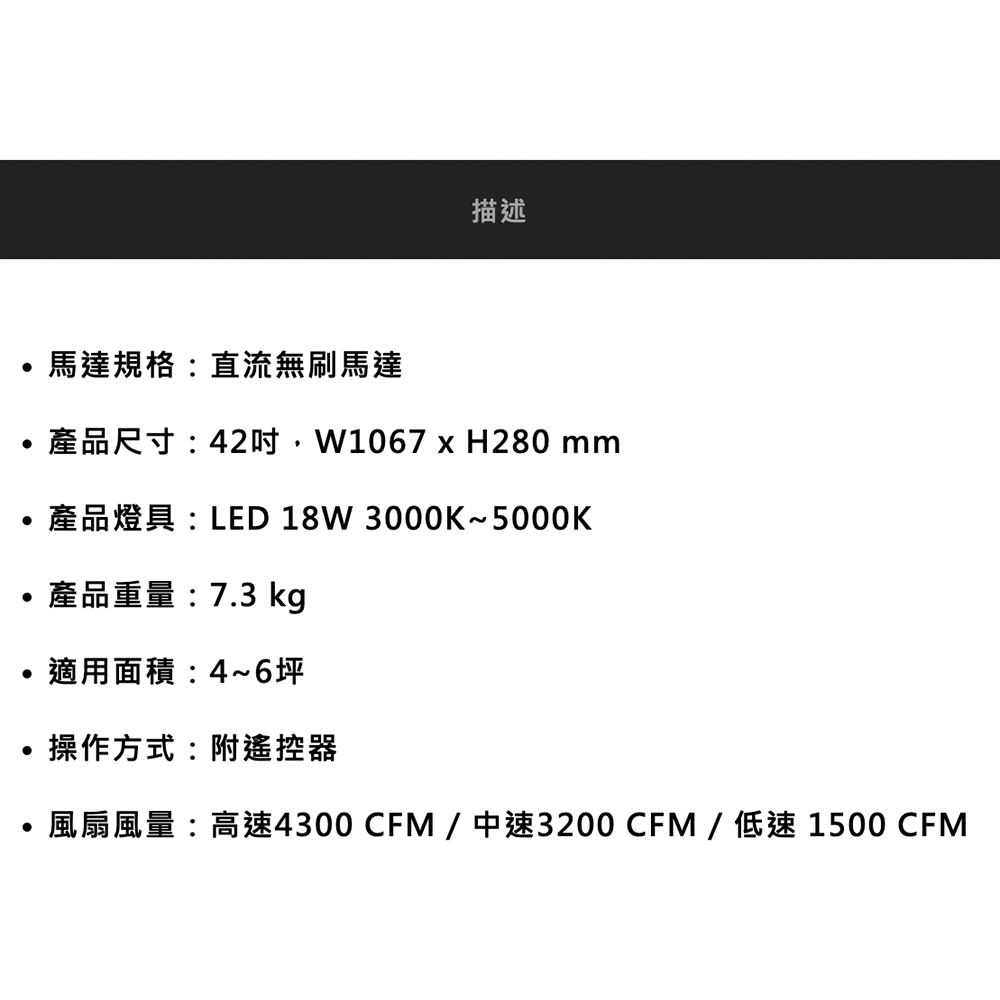 - 風扇風量:高速4300 CFM / 中速3200 CFM / 低速 1500 CFM